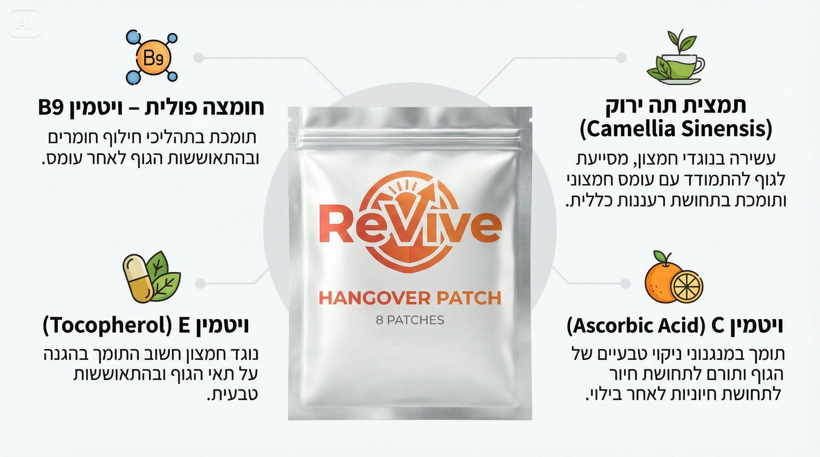 מדבקת ההנגאובר REVIVE מסייעת בהשלמת ויטמינים ורכיבים חיוניים שהגוף מאבד לאחר שתייה.